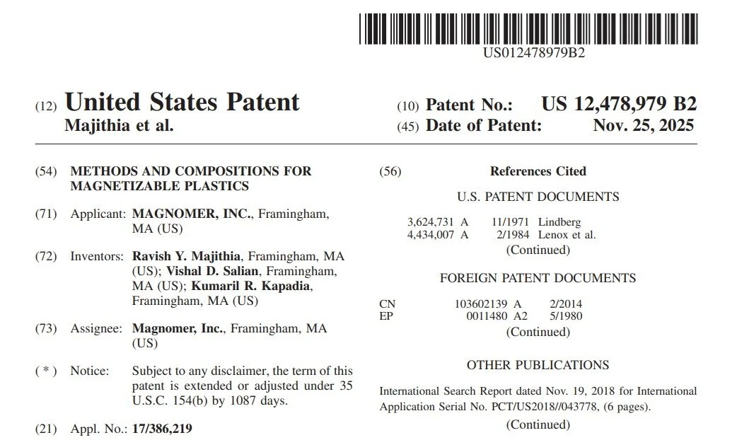 Magnomer was issued it’s third US patent, US 12478979, solidifying its position as a pioneer in sustainable labeling and packaging solution provider. Describing magnetizable substrates with enhanced sortation for efficient recycling and covering a wide range of printing technologies, the patent provides coverage for Magnomer proprietary transparent, food-contact ferromagnetic coatings composition.